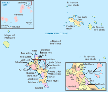 Afrika ada ülkesi Seyşeller kendi içerisinde en üst idari yapı olarak 25 adet ilçeye ayrılmış konumdadır. Söz konusu 25 ilçenin 22 tanesi ana ada olan Mahe adasında yer alırken, 2 tanesi Praslin adasında bulunmaktadır. La Digue adası da kendisine bağlı diğer yan adalar ile birlikte uzağında yer alan birkaç ada ile (bunlar Silhouette, Kuzey, Frégate, Kuş ve Denis adaları) son ilçeyi oluşturmaktadır. Mahe adası dışında kalan üç ilçe iç adalar olarak ifade edilmektedir. Ülkenin sahip olduğu ve Dış adalar (Zil Elwannyen Sesel)) olarak adlandırdığı bölge, yüz ölçümü olarak ülke yüz ölçümünün %46,4'üne sahip olsa da herhangi bir ilçeye bağlı bulunmamakta ve ilçe yapısına da sahip değildir.