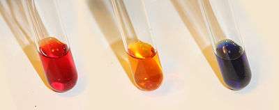 Farklı asit-baz koşullarında timol mavisi çözeltileri renkleri: sol:asidic, orta:nötral, sağ: bazik