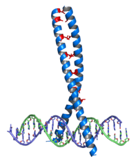 AP-1/DNA kompleksinin yapısı. AP-1, Jun ve Fos transkripsiyon faktörlerinden oluşmuş bir ikilidir, ikisinin birleştiği yerde bir lösin fermuar bölgesi (mavi) oluşur; iki alfa-sarmal arasında bulunan lösin kalıntıları bir fermuarın dişleri gibi birbirlerine geçerler.